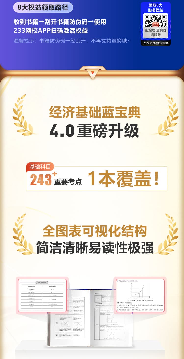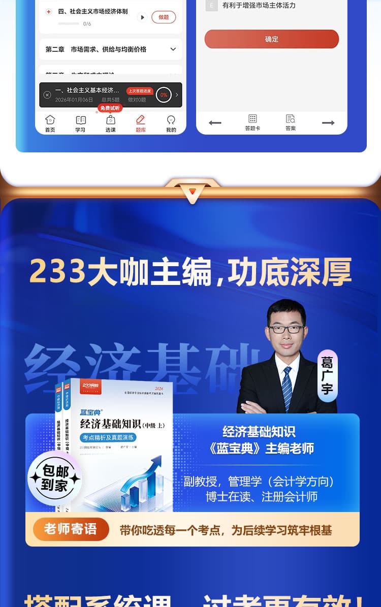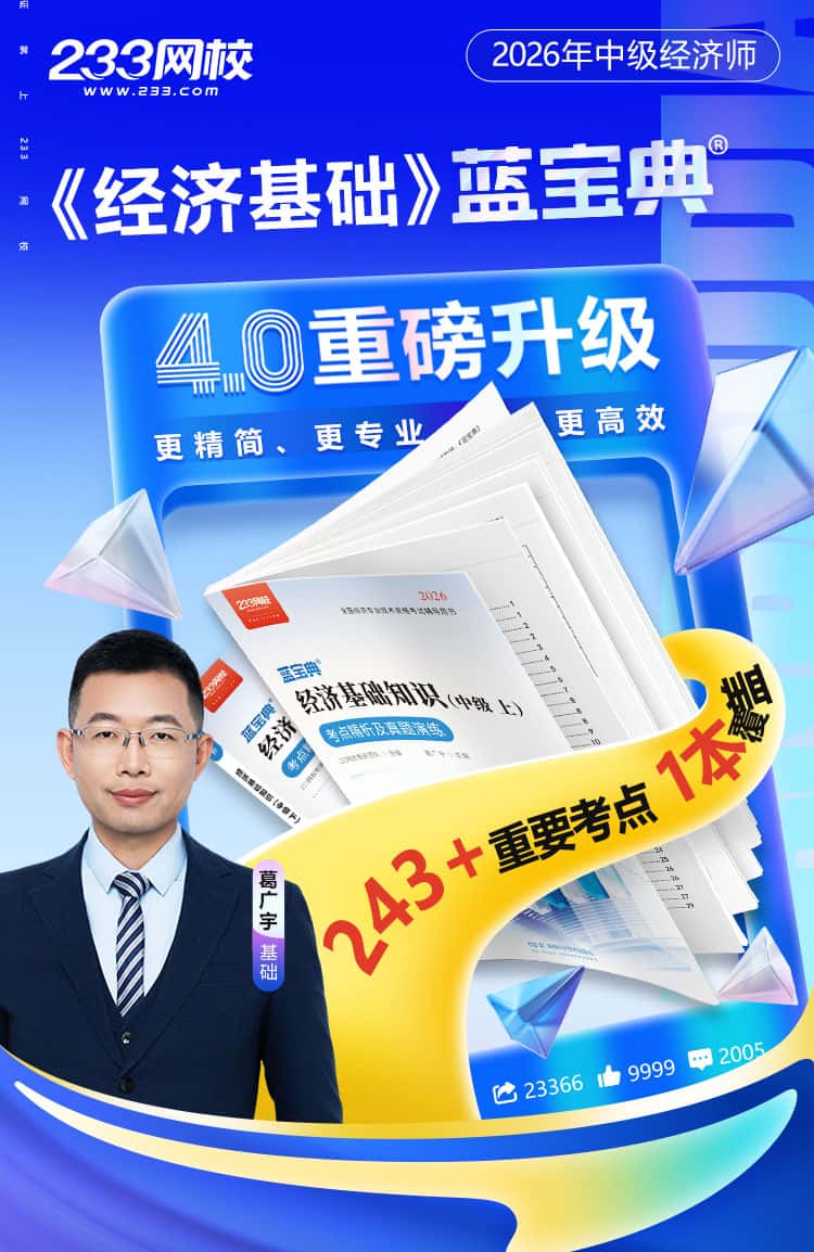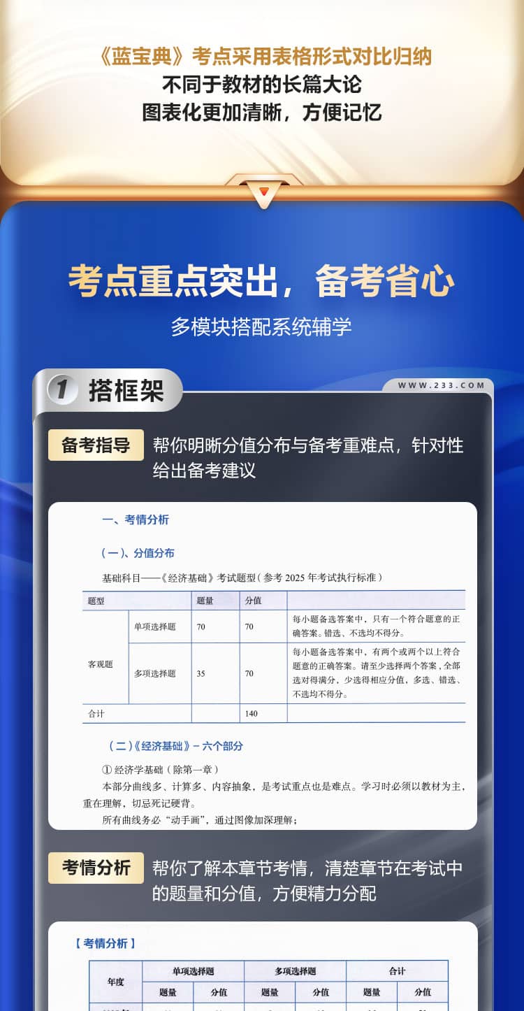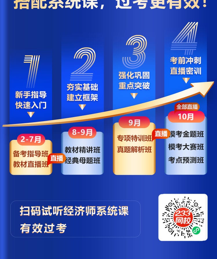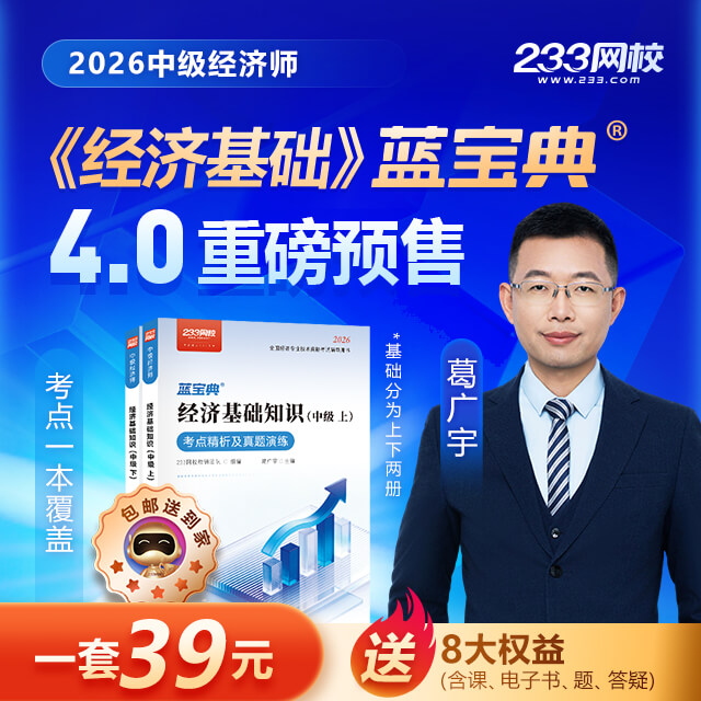 《蓝宝典》搭配233网校独有的4阶体系化课程,在预习-基础-强化-冲刺4个阶段都能发挥至关重要的作用,通过经济师考试,事半功倍。