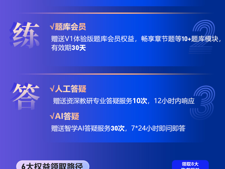 2、赠送30天V1体验版题库会员,随书赠送的题库会员,购书后自动开通,自付款日起计算。